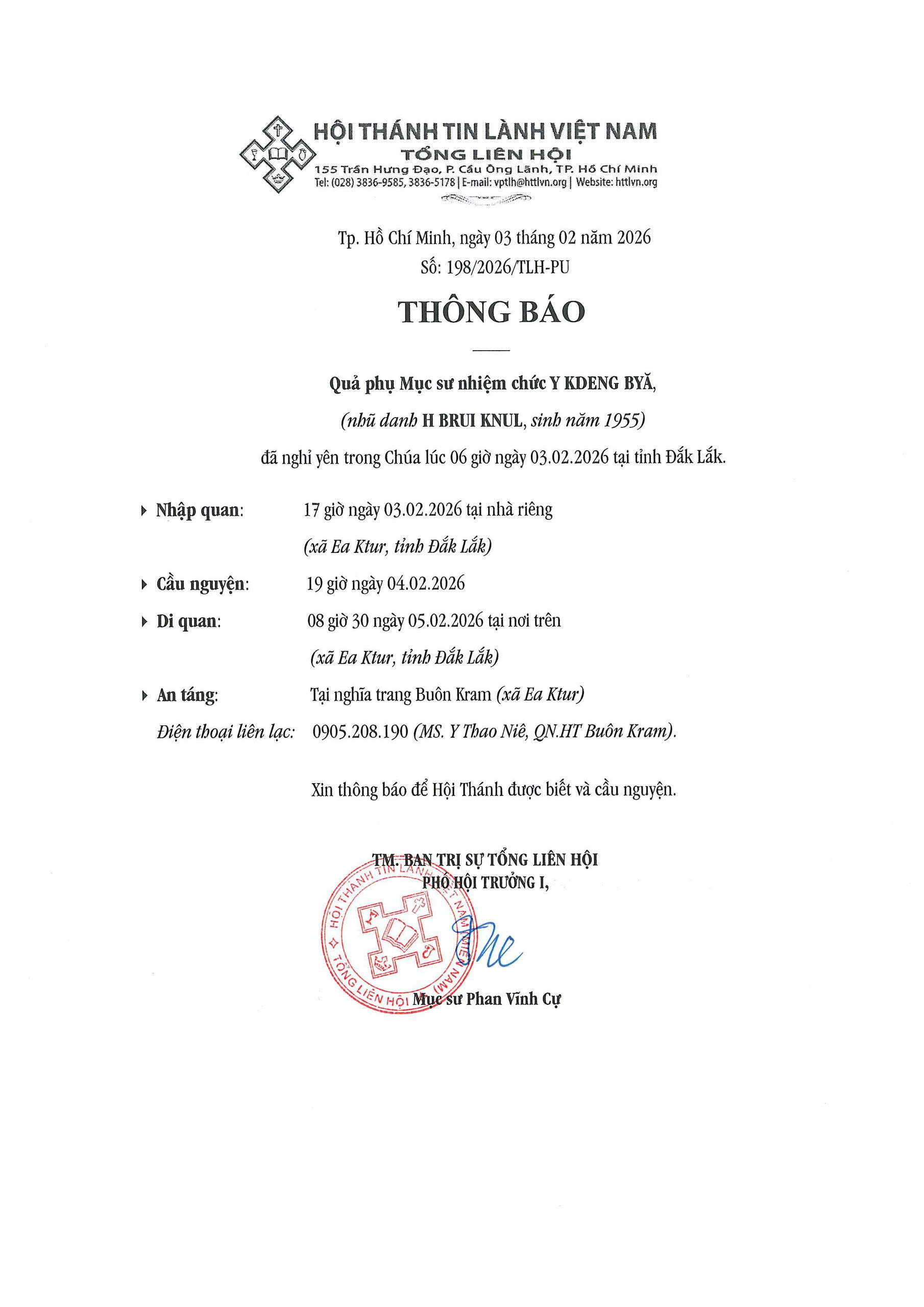 Thư Phân Ưu Cùng Tang Quyến Của Mục Sư Nhiệm Chức GIÀNG A HÒA