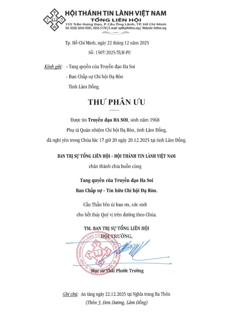 Thư Phân Ưu Cùng Tang Quyến Của Truyền Đạo HA SOI