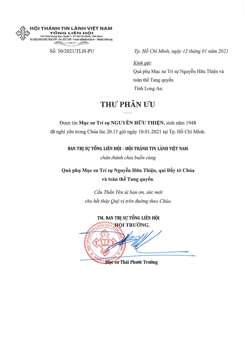 Thư Phân Ưu Cùng Tang Quyến MSTS Nguyễn Hữu Thiện