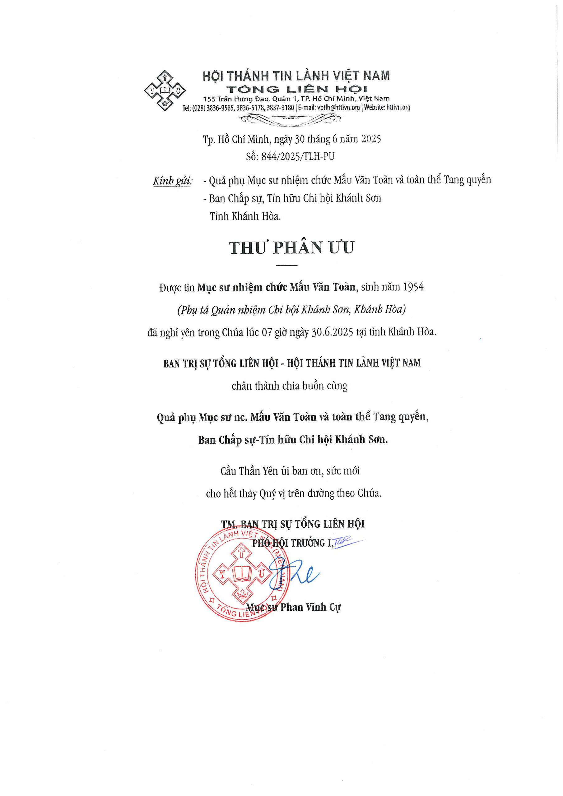 Thư Phân ưu cùng Tang quyến Mục sư Nhiệm chức MẤU VĂN TOÀN