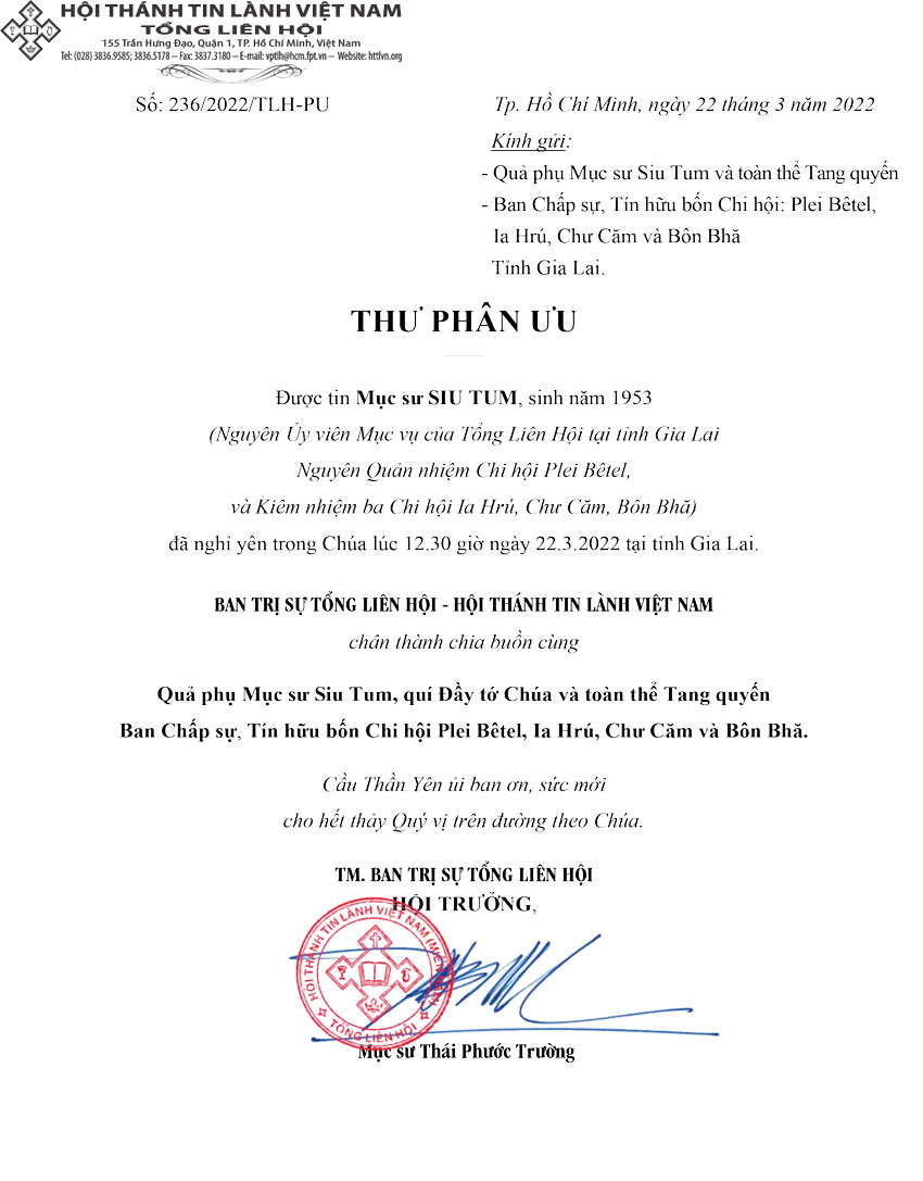 Thư Phân Ưu Cùng Tang Quyến Mục Sư Siu Tum