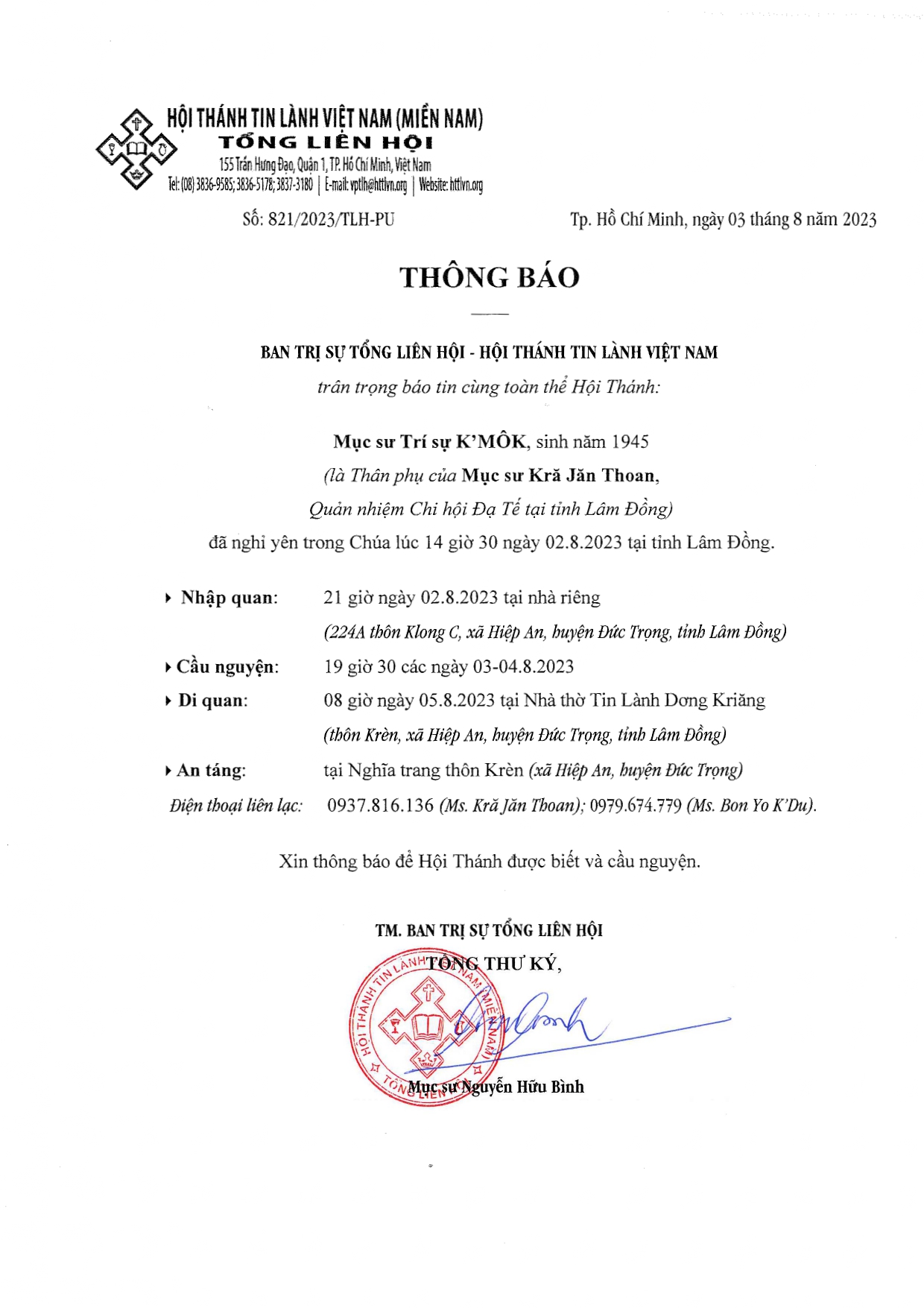 Thư Phân Ưu Cùng Tang Quyến Mục Sư Trí Sự K’Môk