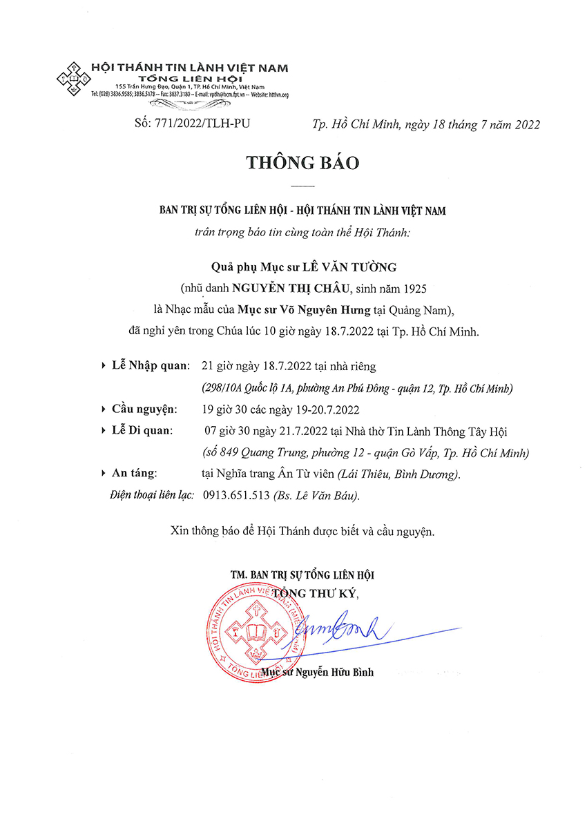 Thư Phân Ưu Cùng Tang Quyến Quả Phụ Mục Sư Lê Văn Tường