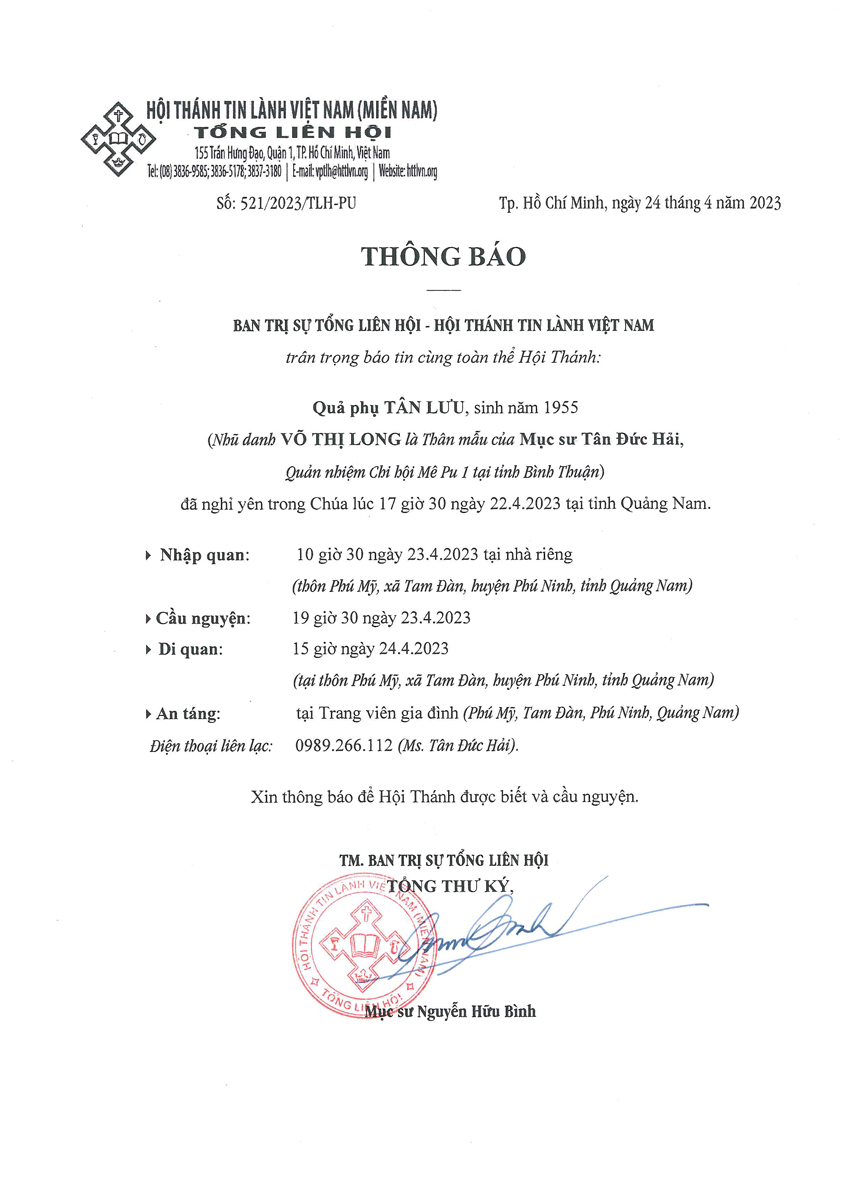 Thư Phân Ưu Cùng Tang Quyến Quả Phụ TÂN LƯU