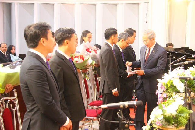 Mục sư Phạm Trọng Huy, Phó Chủ tịch HĐGP – UV HĐTV&TPMS KV II, đọc biên bản tấn phong và trao quyết định tấn phong cho 05 vị MSNC cầu phong