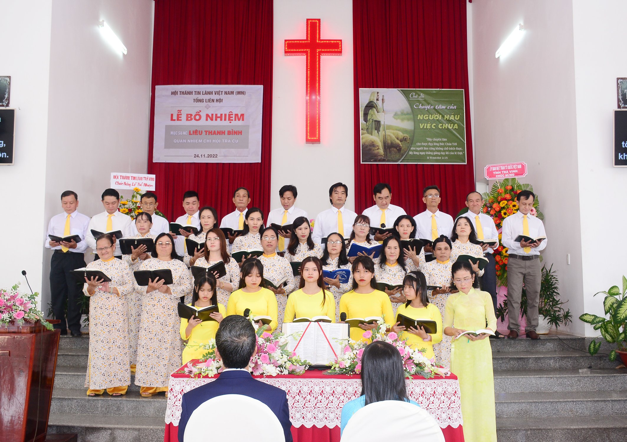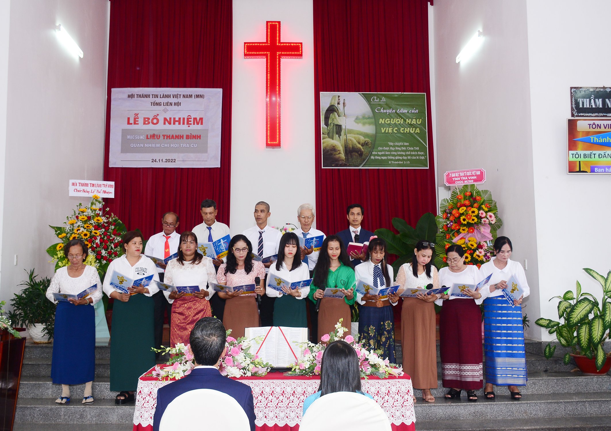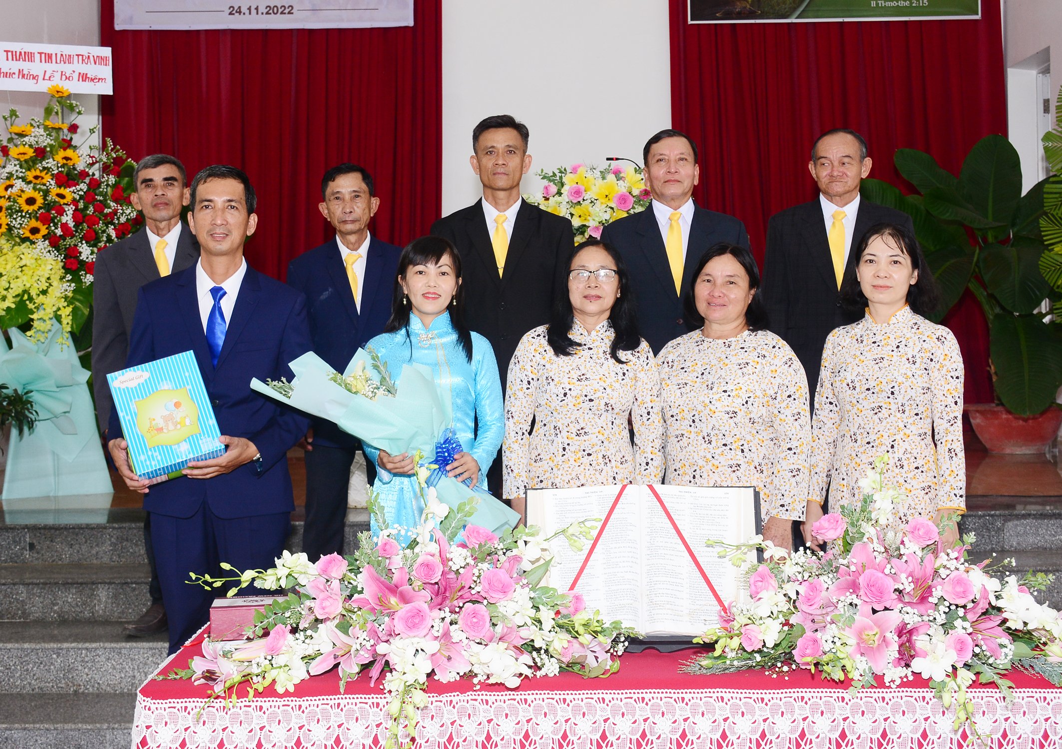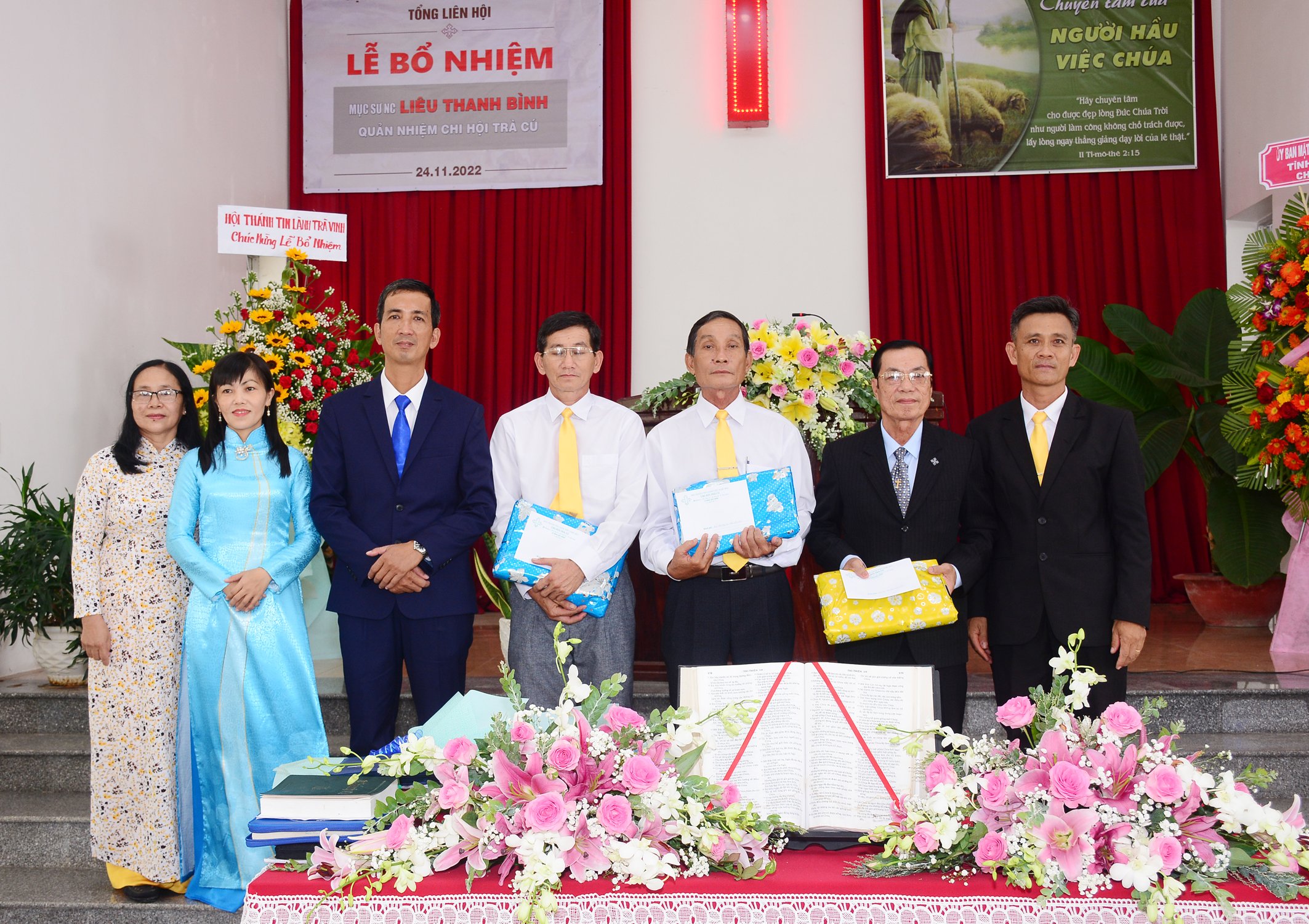 Sau đó Mục sư chủ lễ đã thay mặt Ban Trị sự Tổng Liên Hội để thực hiện nghi thức bổ nhiệm, trao giáo vụ lệnh và ấn tín để Mục sư Nhiệm chức Liêu Thanh Bình chính thức trở thành Quản nhiệm Hội Thánh Trà Cú.