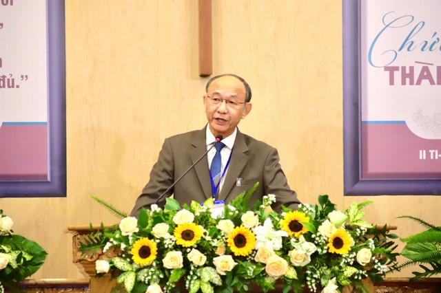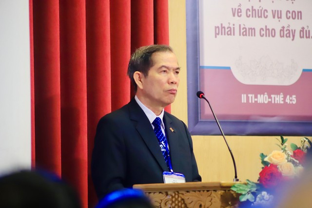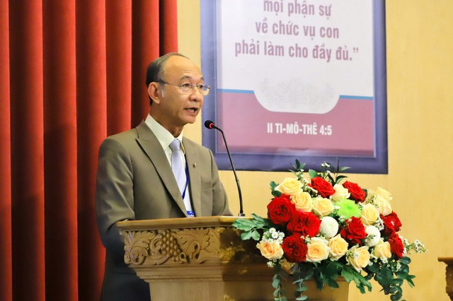 Mục sư Phan Vĩnh Cự, Trưởng Ban Tổ chức, thông báo giảng huấn