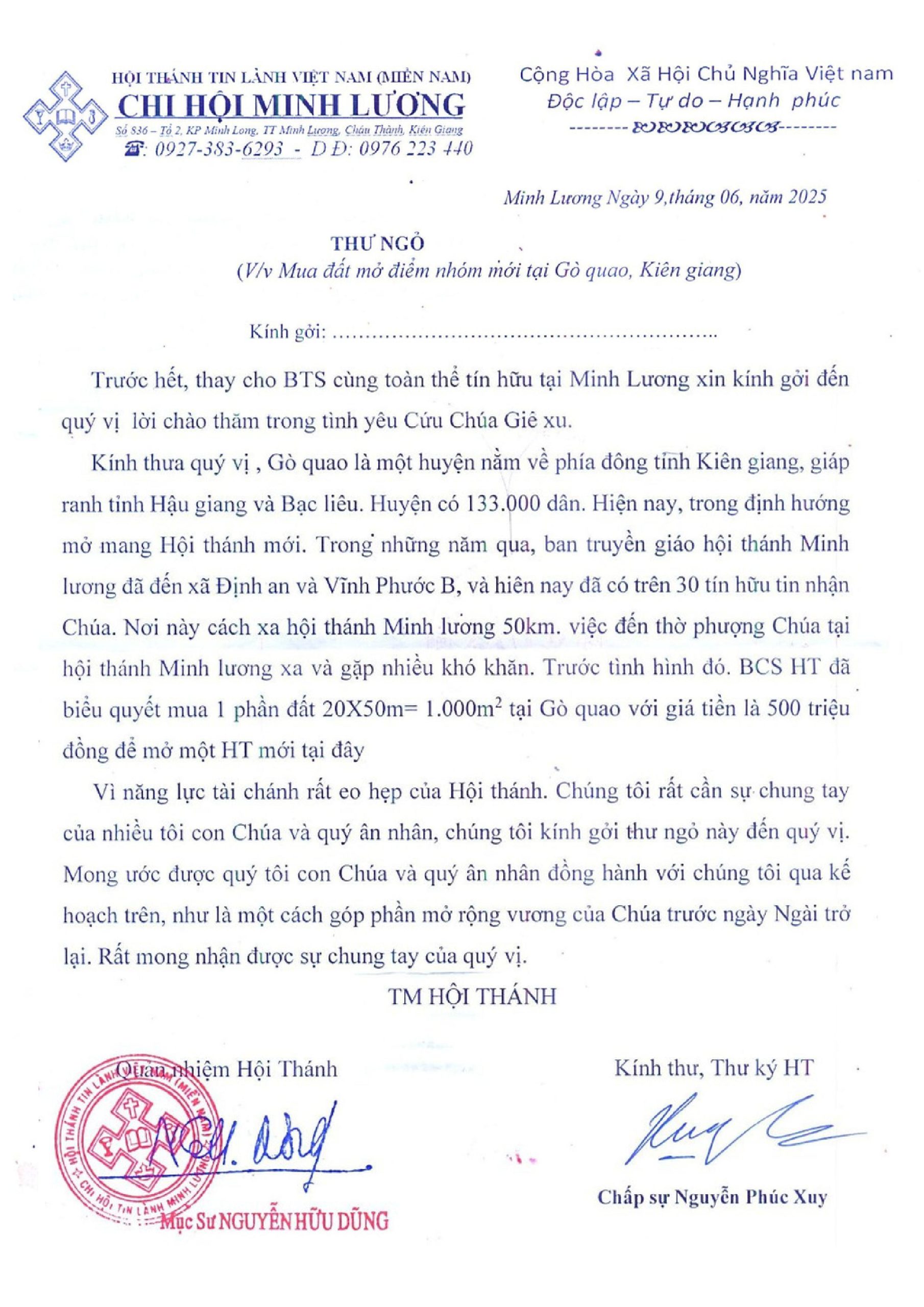 UB. Kiến Thiết: Thư ngỏ V/v Chi Hội Minh Lương Mua Đất Mở Điểm Nhóm Mới Tại Gò Quao – Kiên Giang