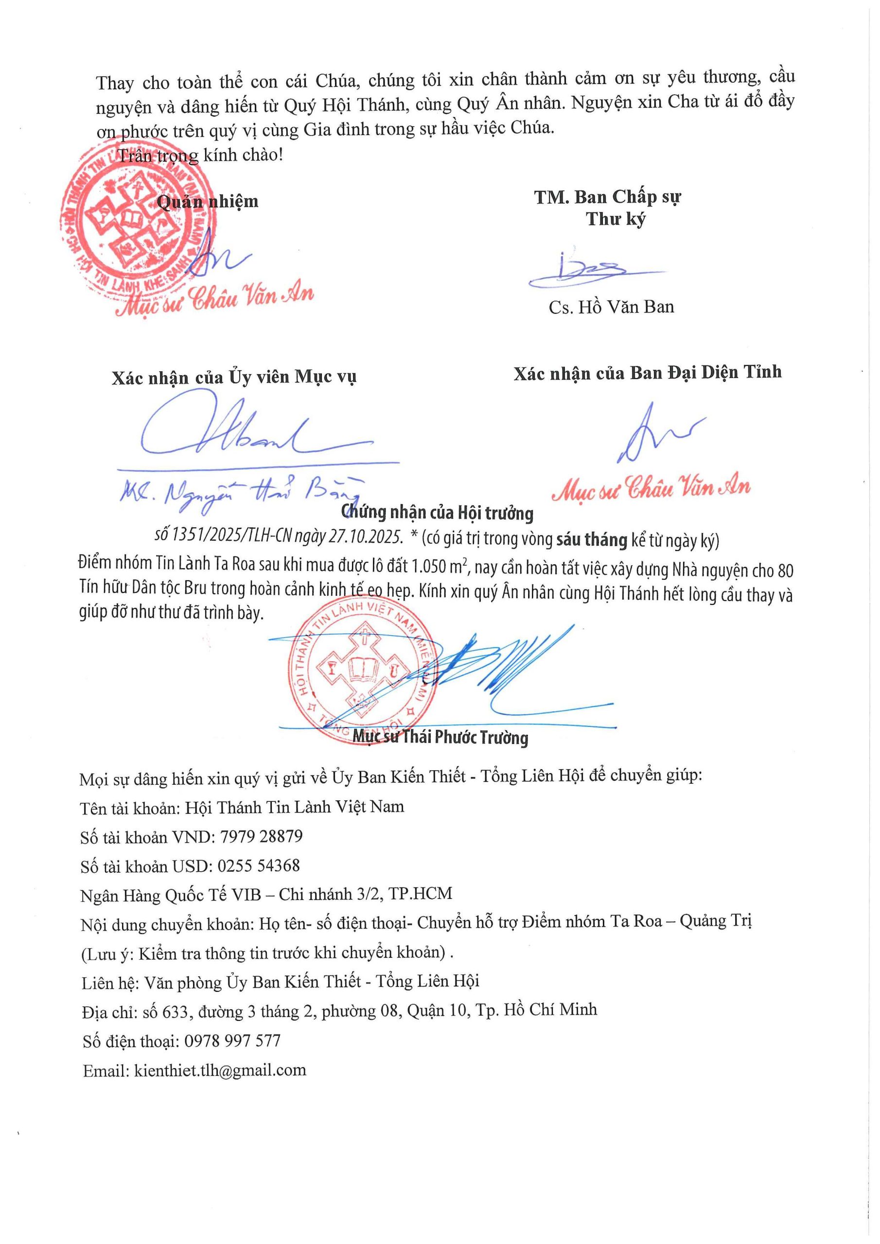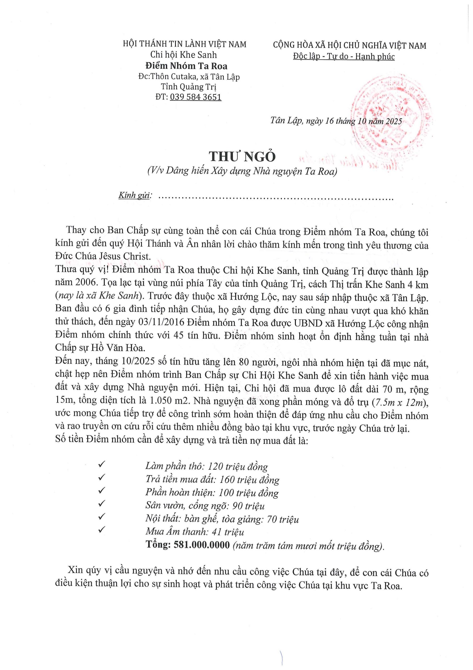 UB. Kiến Thiết: Thư ngỏ V/v Dâng Hiến Xây Dựng Nhà Nguyện Ta Roa – Quảng Trị