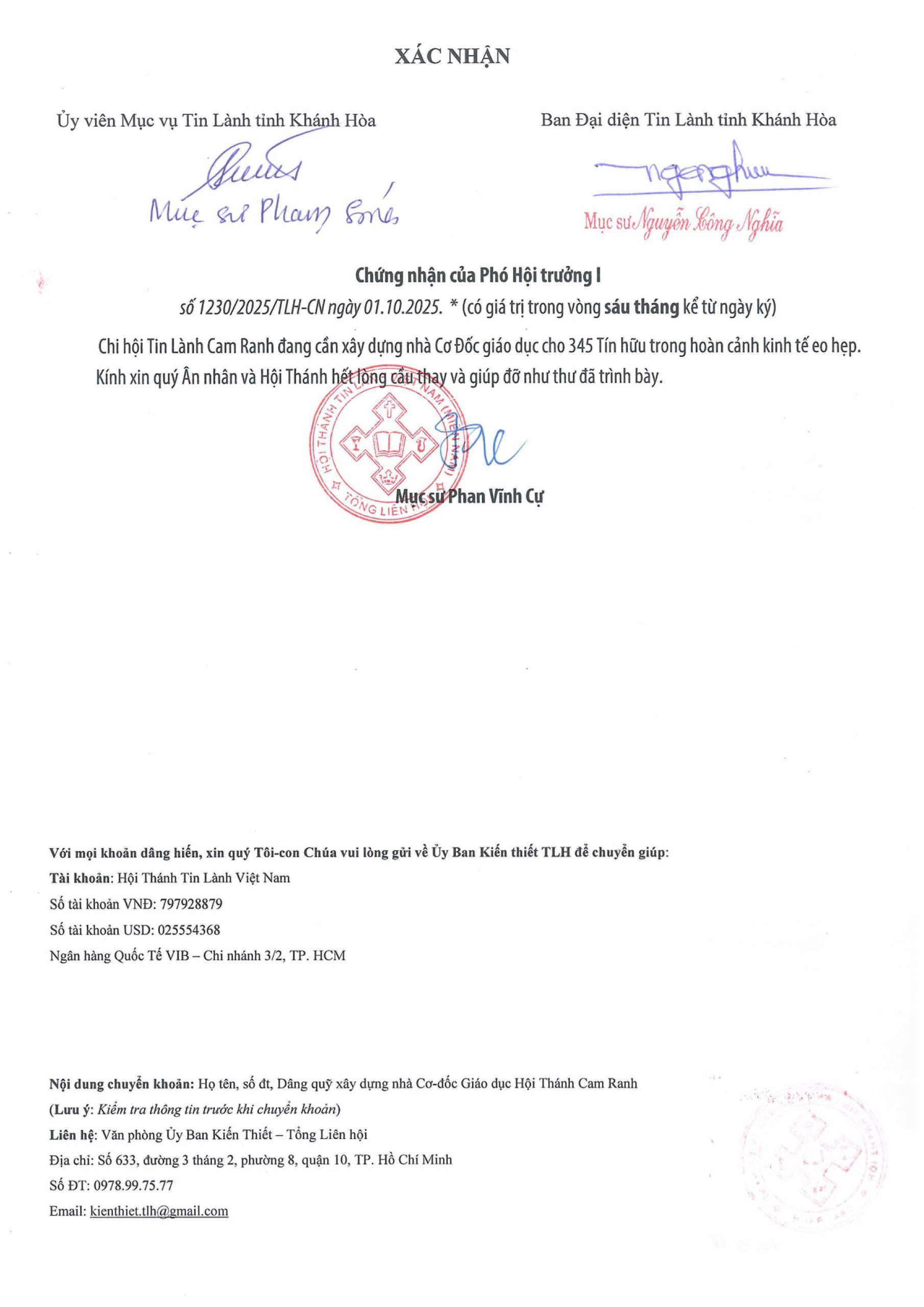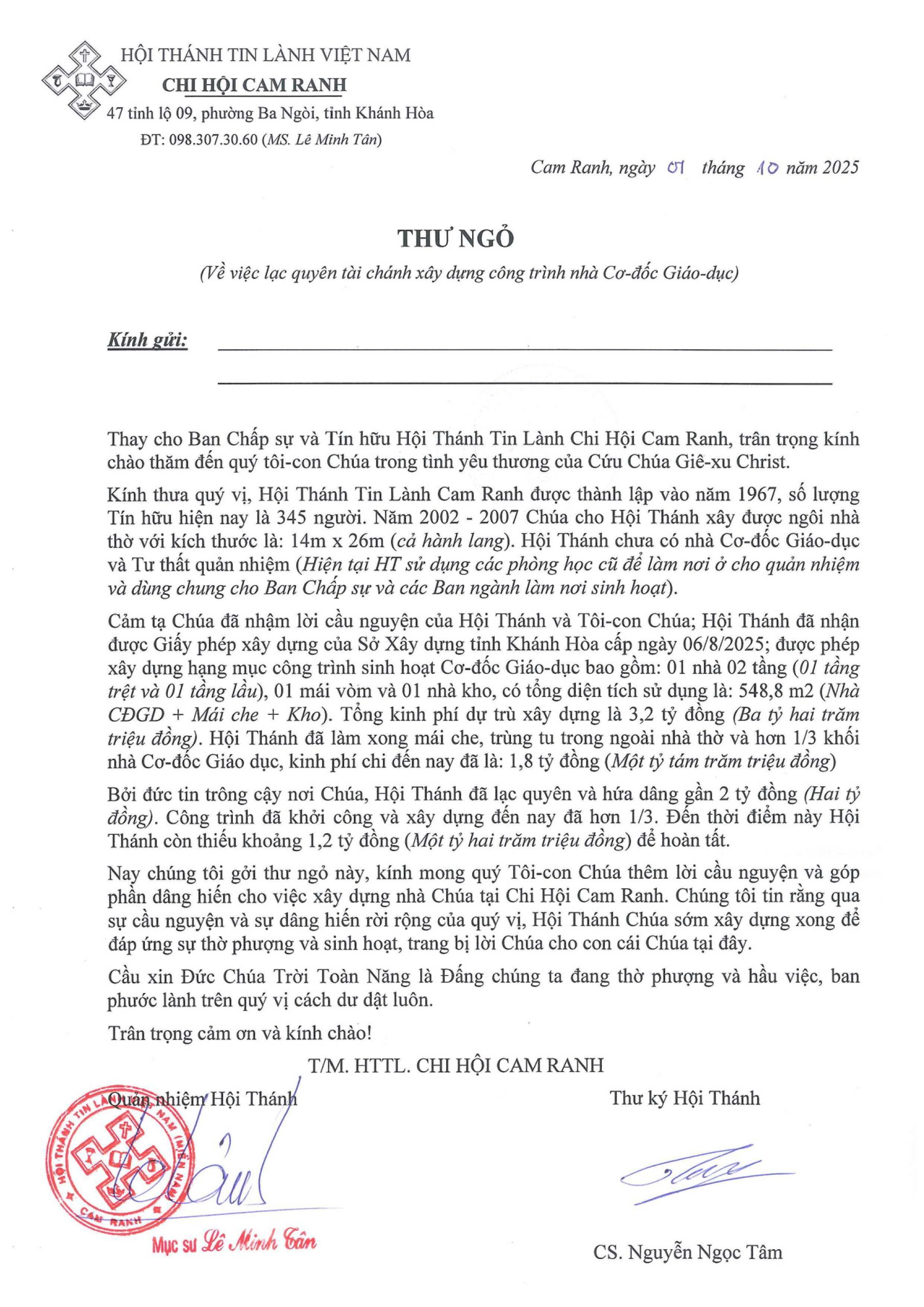 Nhu Cầu Xây DựngUB. Kiến Thiết UB. Kiến Thiết: Thư ngỏ V/v Xây Dựng Nhà Cơ Đốc Giáo Dục Thuộc Chi Hội Cam Ranh – Khánh Hòa 03/10/2025 2572 Ngày khởi công xây dựng Hiện trạng xây dựng Tháng 10.2025