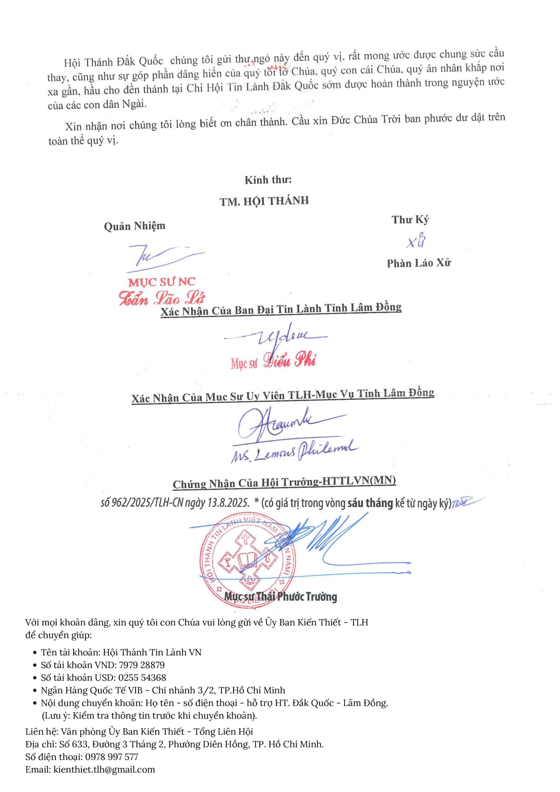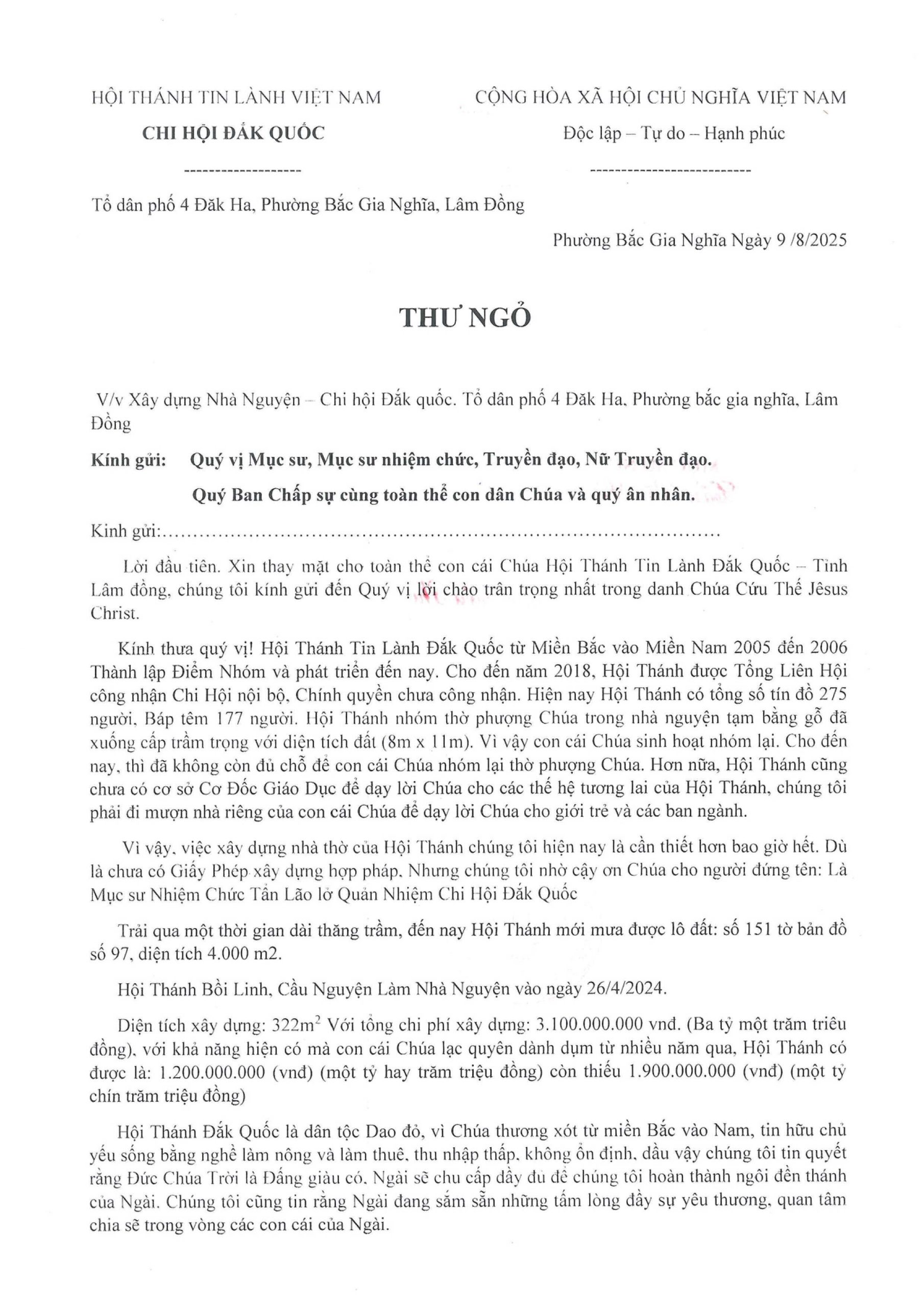 UB. Kiến Thiết: Thư ngỏ V/v Xây Dựng Nhà Nguyện Đắk Quốc – Lâm Đồng