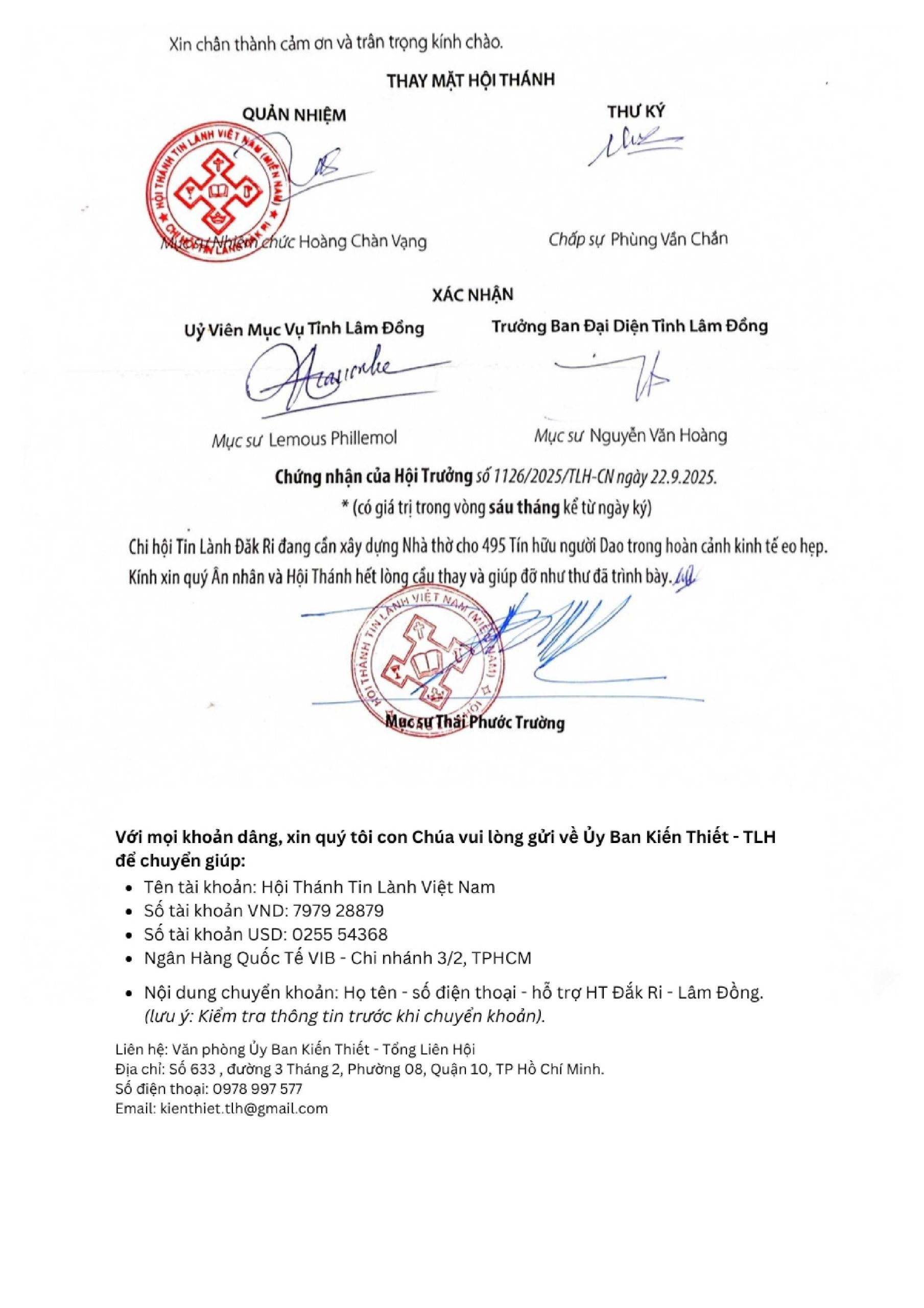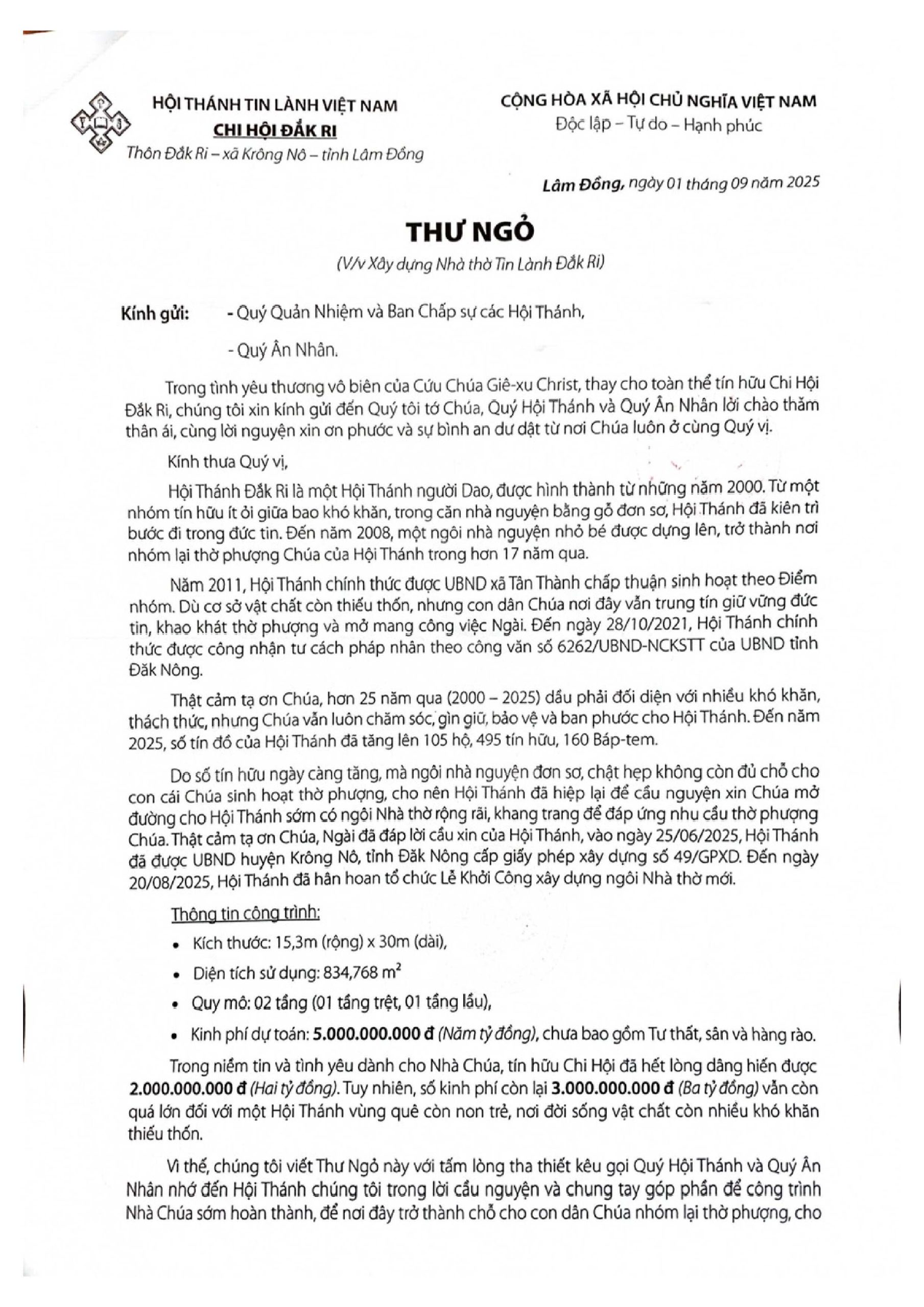 UB. Kiến Thiết: Thư ngỏ V/v Xây Dựng Nhà Thờ Tin Lành Đắk Ri – Lâm Đồng