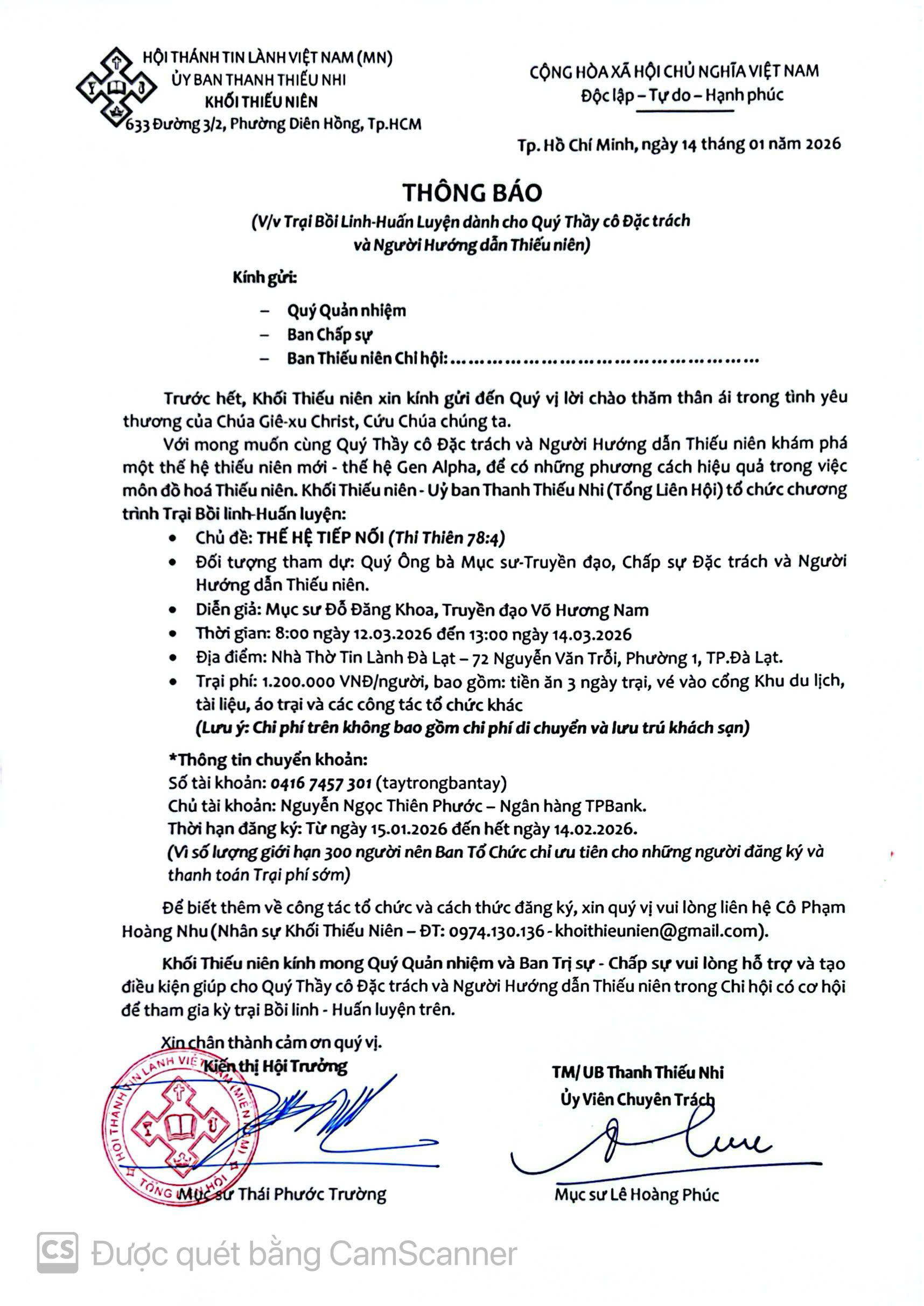 Thông Báo UBTTNUB. Thanh Thiếu Nhi UB.TTN – Thông Báo V/v Trại Bồi Linh – Huấn Luyện dành cho Thầy cô Đặc trách và Người Hướng dẫn Thiếu niên 04/02/2026 185