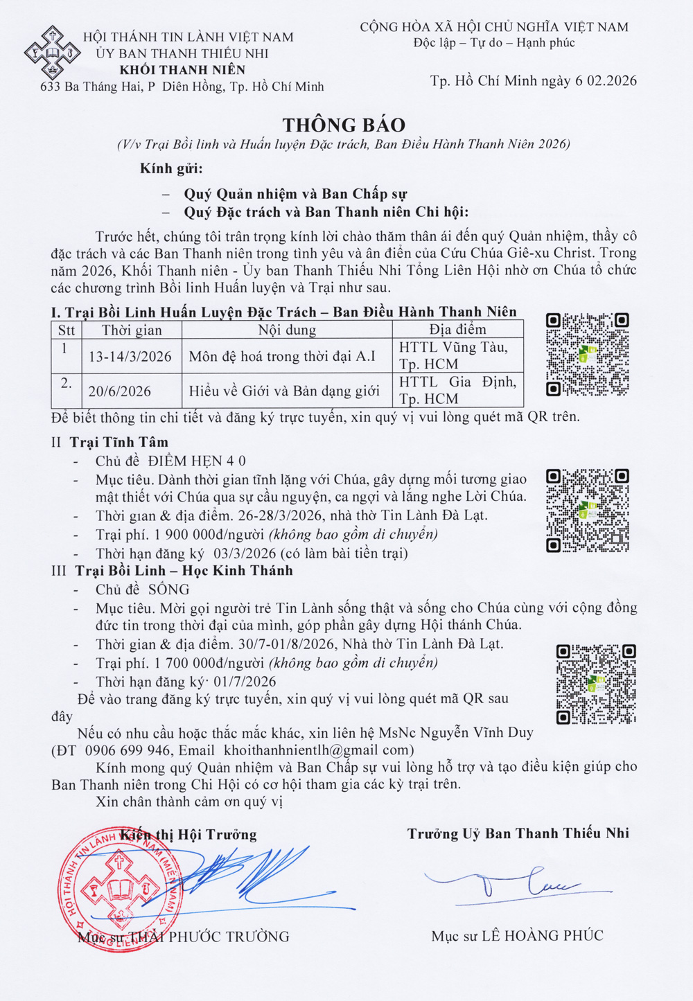 Thông BáoThông Báo UBTTN UB.TTN – Thông Báo V/v Trại Bồi Linh Và Huấn Luyện Đặc Trách, Ban Điều Hành Thanh Niên 2026 10/02/2026 2