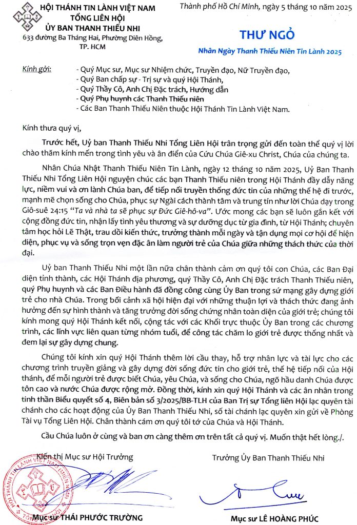Thông BáoUB. Thanh Thiếu Nhi UB.TTN – Thư Chúc Mừng Nhân Ngày Thanh Thiếu Niên Tin Lành 2025 10/10/2025 5647