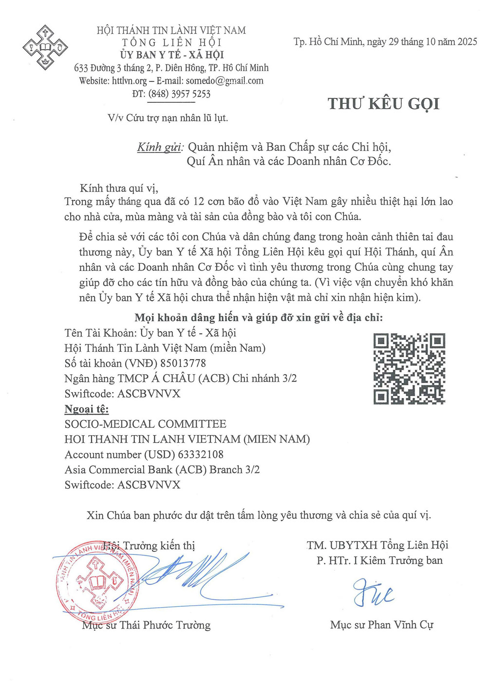 Thông BáoThông Báo UBYTXHTin Quan Trọng UB.YTXH – Thư Kêu Gọi V/v Cứu Trợ Nạn Nhân Lũ Lụt 29/10/2025 13624