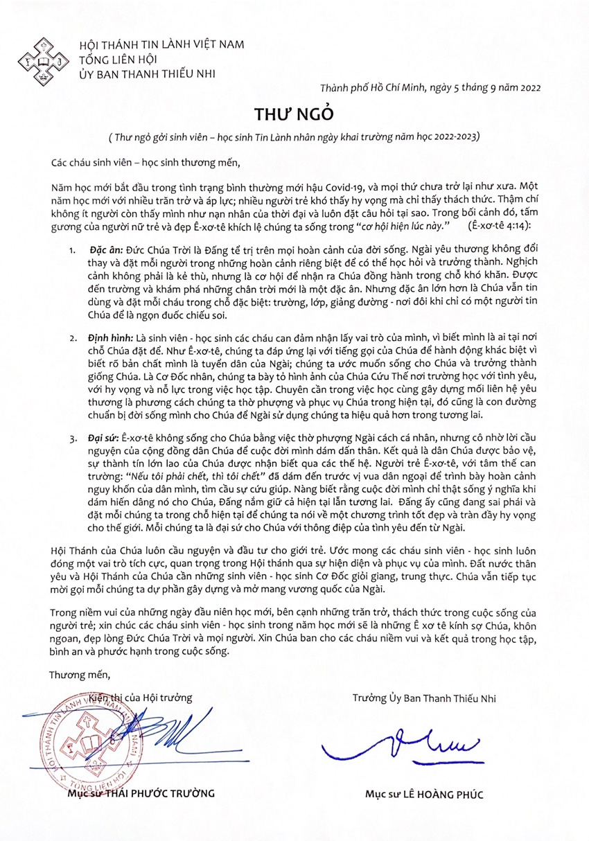 Thông Báo UBTTNUB. Thanh Thiếu Nhi Ủy Ban Thanh Thiếu Nhi: Thư Ngỏ Gởi Sinh Viên – Học Sinh Tin Lành Nhân Ngày Khai Trường Năm Học 2022 – 2023 05/09/2022 3285