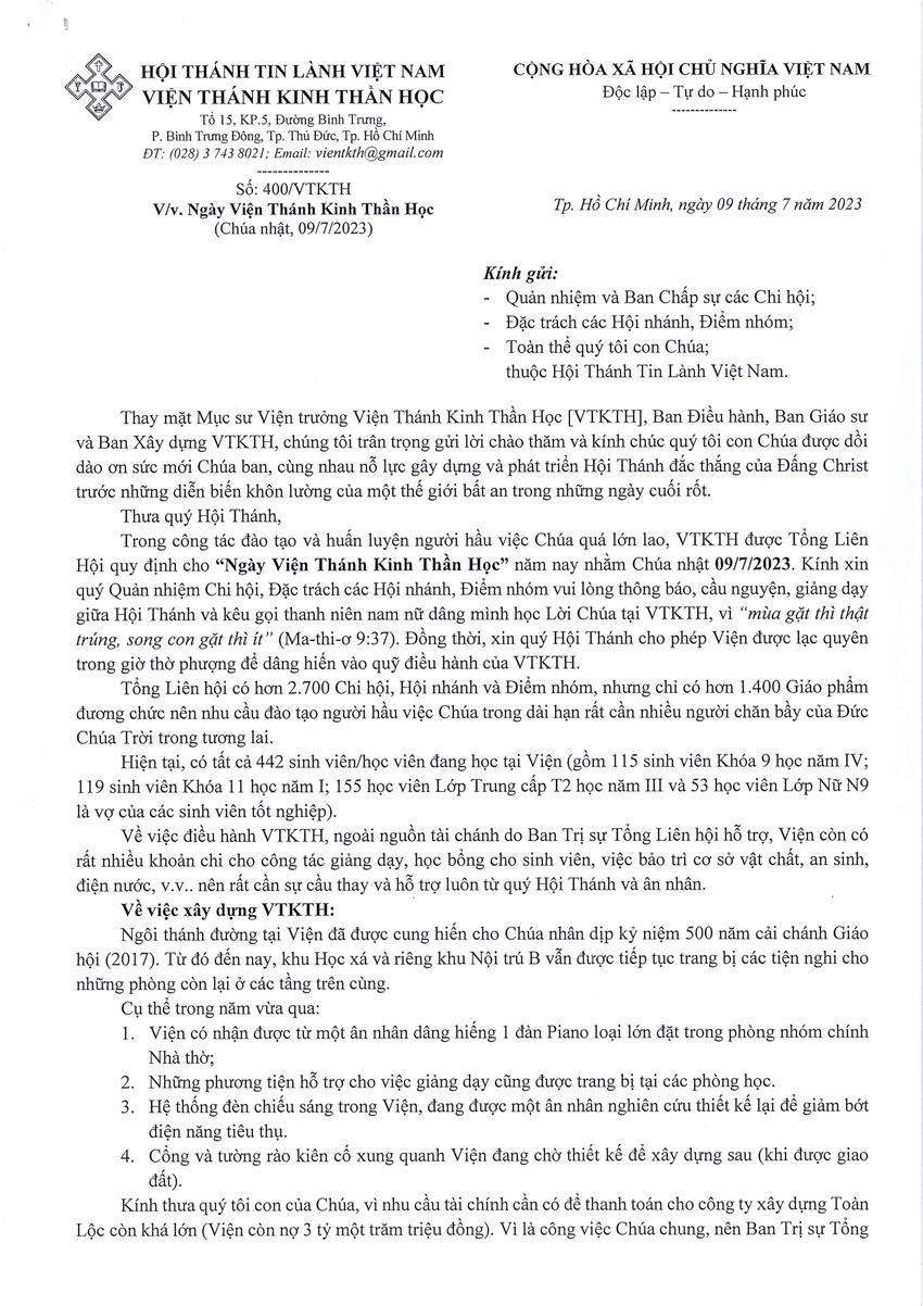 Viện Thánh Kinh Thần Học Thông Báo V/v Ngày Viện Thánh Kinh Thần Học Của Hội Thánh Tin Lành Việt Nam