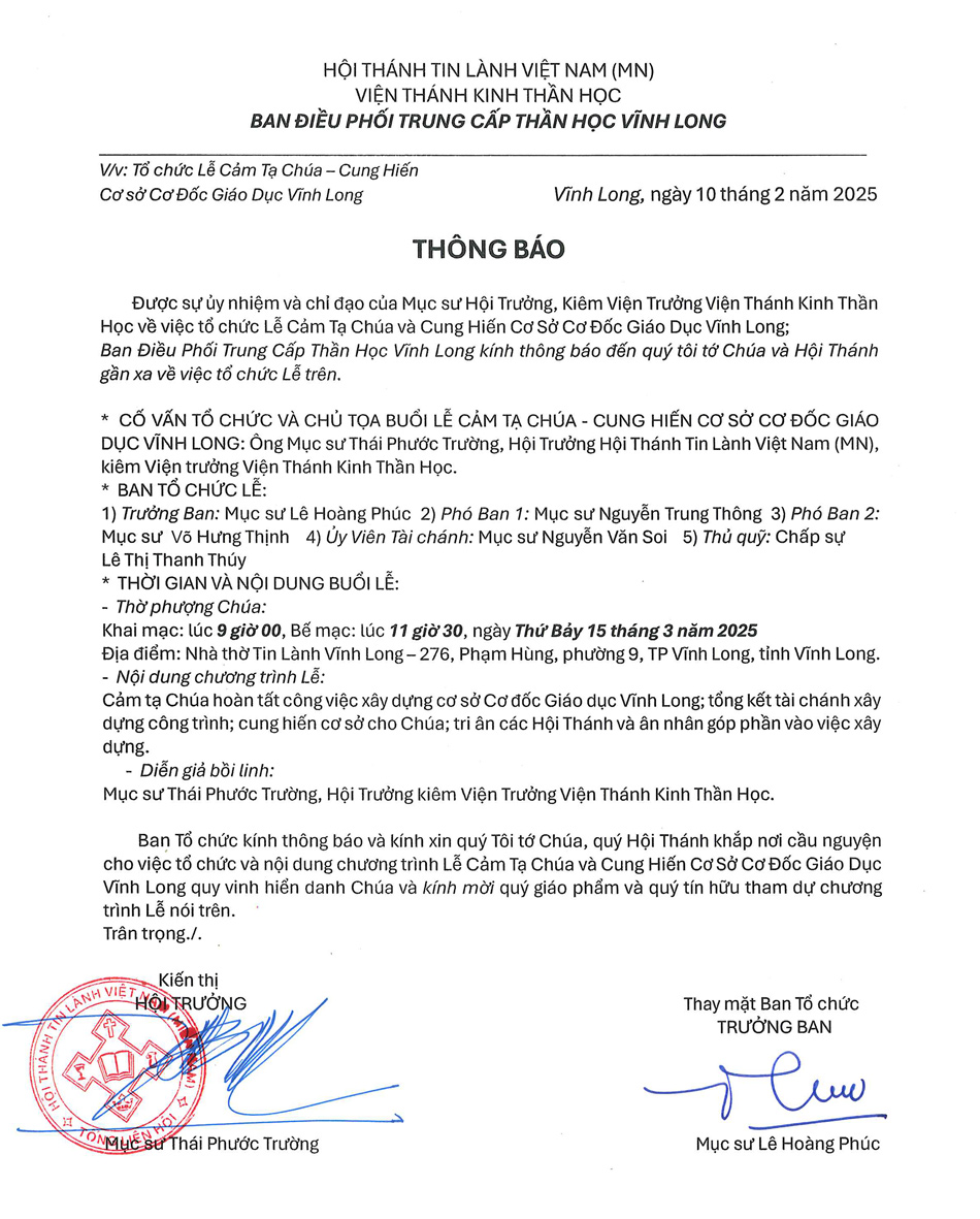 Thông Báo Viện TKTH – Thông Báo V/v Tổ Chức Lễ Cảm Tạ Chúa – Cung Hiến Cơ Sở Cơ Đốc Giáo Dục Vĩnh Long 11/02/2025 3655